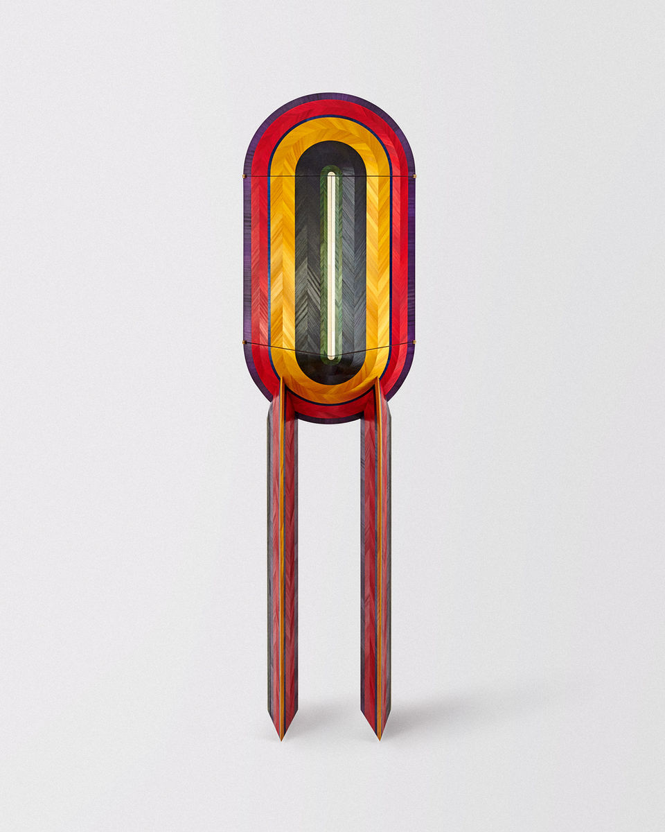 Klaatu takes its name from the humanoid alien visitor in the 1951 film The Day the Earth Stood Still. Klaatu who comes in peace, delivers a prophetic warning to Earth’s inhabitants and a universal message of equivalence. The figure of Klaatu, humanoid in the film, is cycloptic and sentinel-like in character, and this similarity finds expression in this cabinet. In contrast, while Klaatu is monochrome, this interpretation uses ribbons of concentric colour to dress the body and the legs in a uniform, giving the piece an abstract anthropomorphic quality.